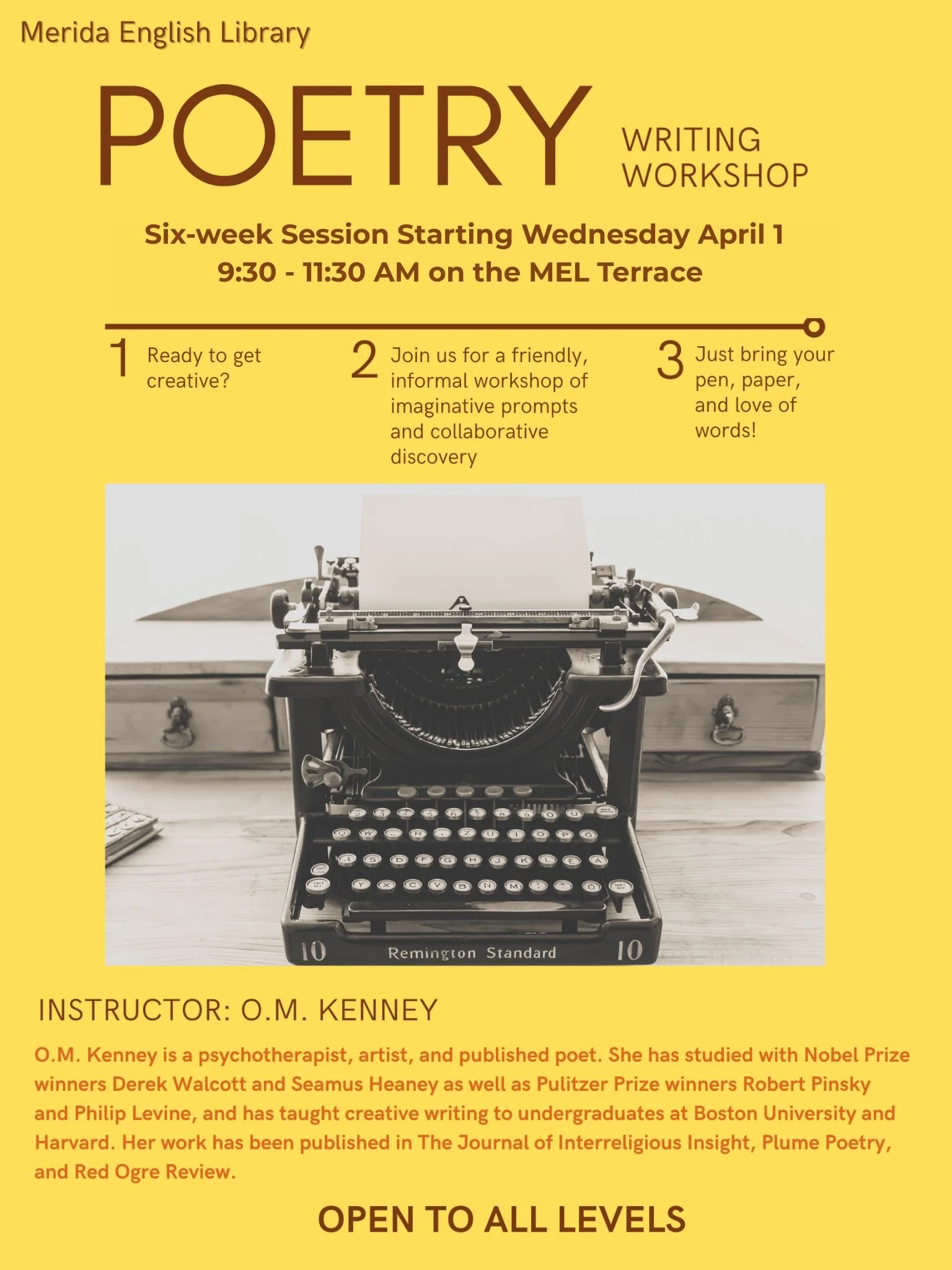 Ready to write? Poetry Writing Workshop with Olya is back! This fun and informal workshop of imaginative prompts and collaborative discovery will help spark your creative genius. Just bring your pen, paper, and love of words! All collections will receive feedback from the instructor at the end of the workshop. This six-week course is free and open to all levels and begins on Wednesday April 1 at 9:30 AM, ending at 11:30 AM. Join your classmates on the second floor terrace at MEL.